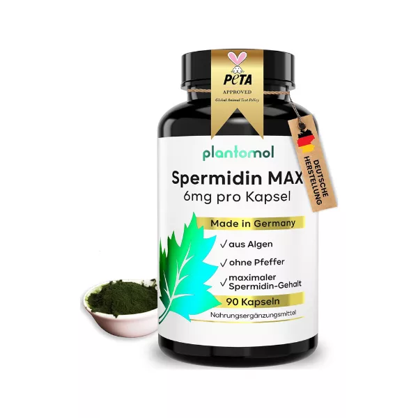 Der Spermidingehalt beträgt bei plantomol Spermidin MAX 2,6 mg pro Tagesdosis, sodass die Dosierung in mg pro Kapsel klar ausgewiesen ist und ein gezielter Vergleich mit anderen Produkten möglich wird. plantomol Spermidin MAX enthält Spermidin aus Chlorella-Algen-Extrakt und Spirulina, ist vegan, glutenfrei und frei von künstlichen Zusatzstoffen. Die Herstellung erfolgt unter kontrollierten Bedingungen in Deutschland, und das Produkt wird regelmäßig laborgeprüft, um eine gleichbleibend hohe Qualität sicherzustellen. Durch die transparente Deklaration der Inhaltsstoffe eignet sich Spermidin MAX sowohl für Einsteiger als auch für erfahrene Anwender, die ein zuverlässiges Spermidin-Supplement suchen.